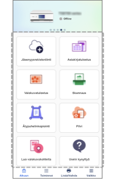 Aloitusnäytön valikkoa voi räätälöidä, jotta usein käytettyihin toimintoihin pääsee helposti käytettäessä eri tulostimia esimerkiksi kotona tai toimistolla.