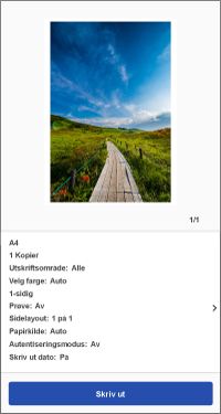 4. På [Forhåndsvis]-skjermbildet kontrollerer du forhåndsvisningen og utskriftsinnstillingene.