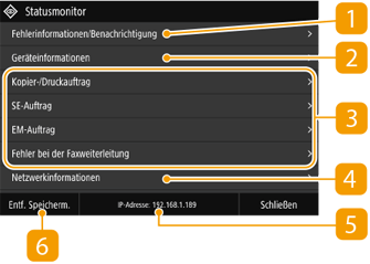 Wenn Sie <Statusmonitor> auswählen, wird ein Bildschirm angezeigt, auf dem Sie die Statusangaben zu Dokumenten sowie den Status des Geräts und die Informationen zu Netzwerkeinstellungen überprüfen können.