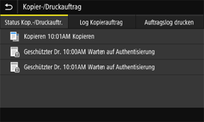Zeigt den aktuellen Status des ausgewählten Auftrags an. Im Folgenden sehen Sie als Beispiel den Bildschirm <Kopier-/Druckauftrag>.