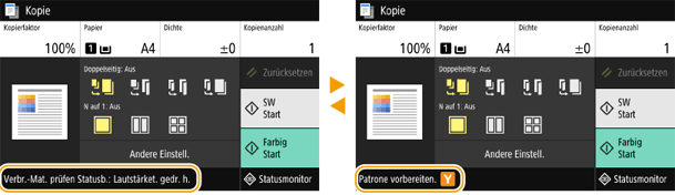 Meldungen werden auf dem Bildschirm angezeigt, wenn beispielsweise das Papier ausgeht oder die Tonerpatrone das Ende ihrer Nutzungsdauer erreicht. Meldungen werden wie bei den folgenden Bildschirmen abwechselnd angezeigt. Weitere Informationen finden Sie unter