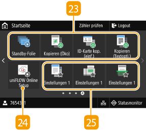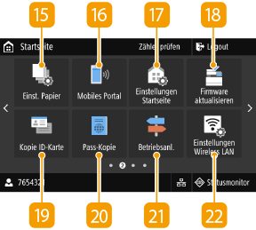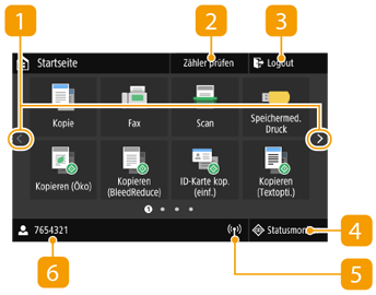 Der Bildschirm Startseite oder der Einstellungsbildschirm wird auf dem Display angezeigt, so dass Sie Funktionen wie das Kopieren oder Scannen initiieren können. Sie können im Display auch Informationen überprüfen, wie Fehlermeldungen oder den Betriebsstatus des Geräts. Bei dem Bildschirm handelt es sich zudem um ein Touchpanel, so dass Sie Vorgänge durch direktes Berühren des Bildschirms durchführen können.