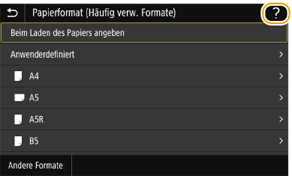 Über diese Schaltfläche werden das Format und der Typ des in die Papierkassette und das Mehrzweckfach eingelegten Papiers angegeben.