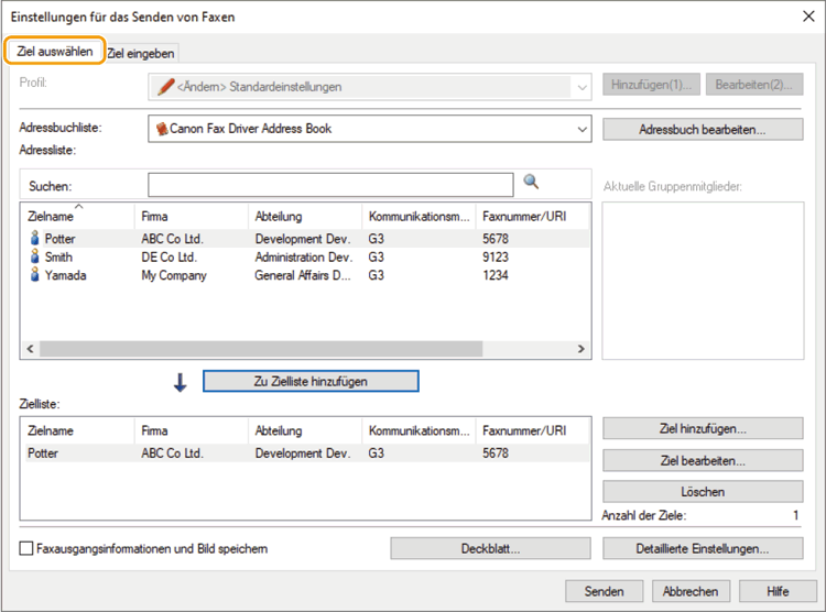 Wenn Sie eine Gruppe als Empfänger hinzufügen, wird die Nummer, die mit der höchsten Priorität eingestellt ist, für den Empfänger angezeigt. Stellen Sie die Nummer im Betriebssystem über [Bearbeiten]