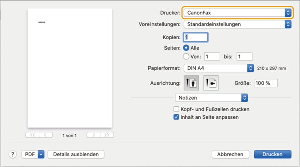 Wählen Sie auf dem Druckbildschirm den Faxtreiber des Geräts aus.