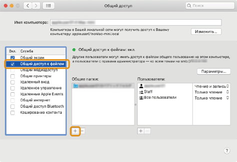 Выберите [Общий доступ к файлам] и щелкните [+] для параметра [Общие папки].