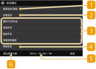 选择 <状态确认> 时,将显示一个画面,可供检查文档状态以及本机状态和网络设置信息。
