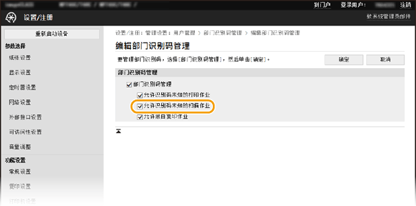 启动远程用户界面并以管理员模式登录 [设置/注册] [用户管理] [部门识别码管理] [编辑] 选择 [允许识别码未知的扫描作业] [确定]![]() |
