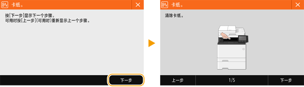 发生卡纸时,画面上会出现 <卡纸。>。选择 <下一步> 以显示简单的纠正措施。如果即使在查看画面后仍然不能肯定,请按照卡纸区域的步骤取出纸张。