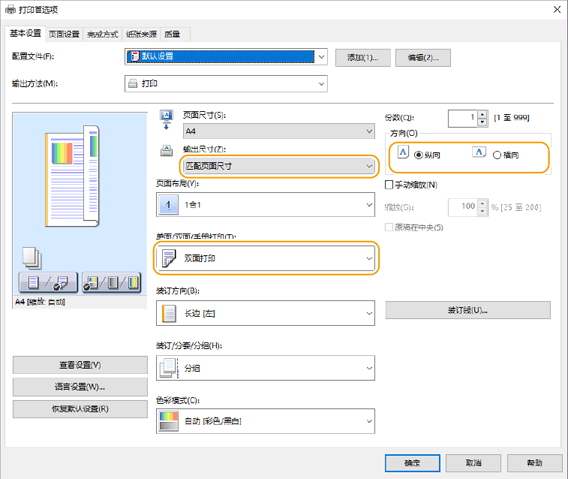 在 [基本设置] 选项卡中,指定纸张尺寸、打印方向和打印面。