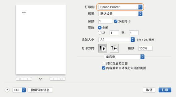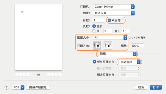 希望在预打印纸张的双面上进行打印时,请选择 [双面打印]。