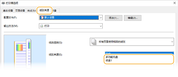 在 [纸张来源] 选项卡中,在 [纸张来源] 中选择装入预打印纸张的纸张来源。