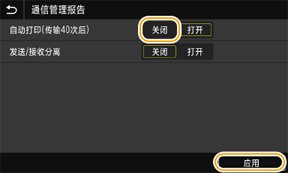 在 <自动打印(传输40次后)> 中选择 <关闭>,然后选择 <应用>。