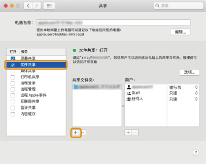 选择 [文件共享],然后单击 [共享文件夹] 的 [+]。