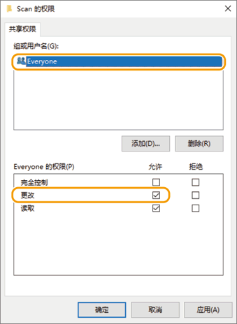 在 [组或用户名] 中选择 [Everyone],然后为 [更改] 勾选 [允许]。