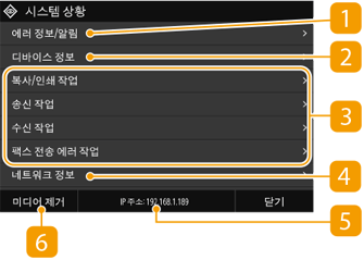 <시스템 상황>을 선택하면 문서의 상태와 기기의 상태 및 네트워크 설정 정보를 확인할 수 있는 화면이 나타납니다.