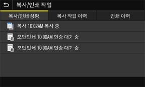 선택된 항목의 현재 상태를 표시합니다. 아래 예시는 <복사/인쇄 작업> 화면입니다.