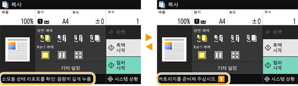 용지가 부족하거나 토너 카트리지 수명이 다하는 등의 상황에서 화면에 메시지가 표시됩니다. 다음 화면과 같이 메시지가 번갈아 표시됩니다. 자세한 내용은