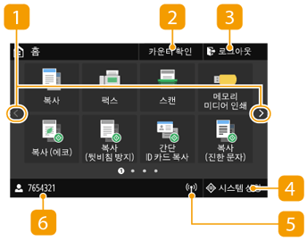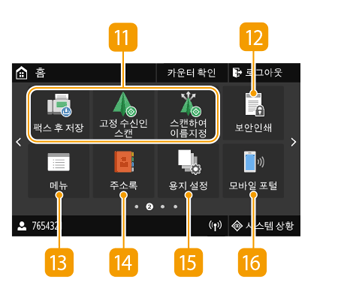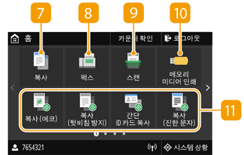 홈 화면 또는 설정 화면이 디스플레이에 표시되어 복사 또는 스캔 등의 기능을 시작할 수 있습니다. 디스플레이를 사용하여 오류 메시지 및 기기 조작 상태 등의 정보를 확인할 수도 있습니다. 화면은 터치 패널이므로 화면을 직접 터치하여 기기를 조작할 수 있습니다.