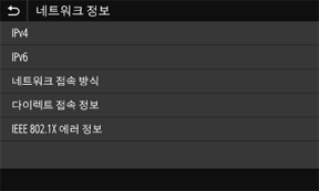 기기의 IP 주소 등의 네트워크 설정 및 무선 LAN 통신 상태 등의 상태를 표시합니다.