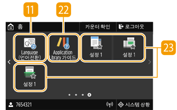 을 누르면 홈 화면이 표시됩니다. 이 화면을 사용하여 설정을 지정하고 기능을 등록합니다.
