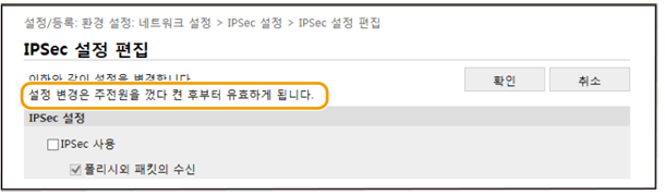 "설정 변경은 주전원을 껐다 켠 후부터 유효합니다." 메시지가 표시되면 기기를 껐다가 10초 후에 기기를 켜십시오.