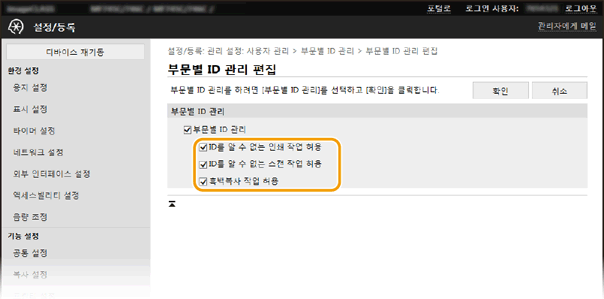 리모트 UI를 시작하고 시스템 관리자 모드로 로그인 [설정/등록] [사용자 관리] [부문별 ID 관리] [편집] [ID를 알 수 없는 인쇄 작업 허용]/[ID를 알 수 없는 스캔 작업 허용]/[흑백복사 작업 허용] [확인] 선택![]() |