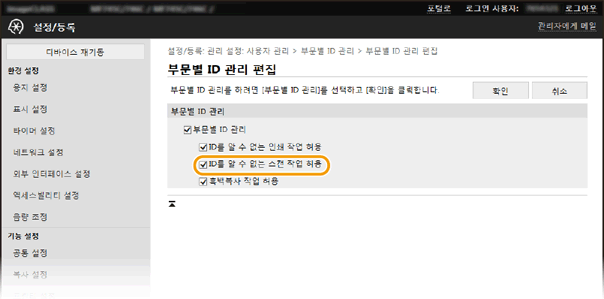 리모트 UI를 시작하고 시스템 관리자 모드로 로그인 [설정/등록] [사용자 관리] [부문별 ID 관리] [편집] [ID를 알 수 없는 스캔 작업 허용] [확인] 선택![]() |
