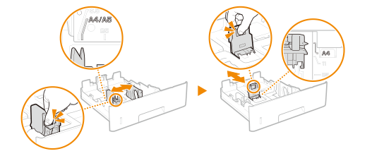 잠금 해제 레버를 잡고 용지 가이드를 움직여 돌출부가 적재할 용지 크기의 인덱스와 정렬되도록 합니다.