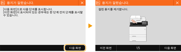 용지가 걸리면 화면에 <용지가 걸렸습니다.>가 나타납니다. <다음 화면>을 선택하면 간단한 수정 조치가 나타납니다. 화면을 확인한 후에도 확실하지 않으면 용지가 걸린 영역의 단계에 따라 용지를 제거하십시오.