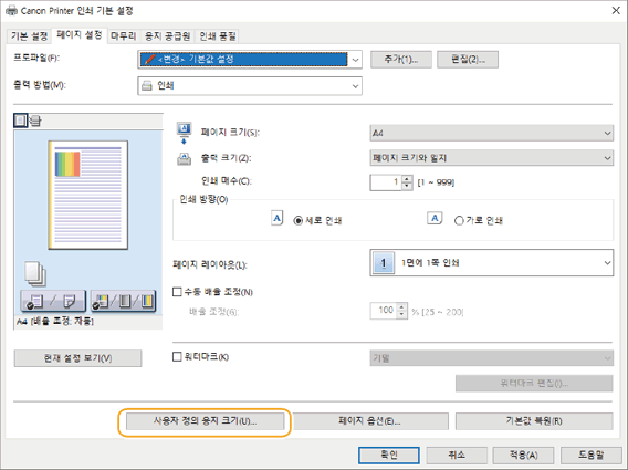 [페이지 설정] 탭을 선택하고 [사용자 정의 용지 크기]를 클릭합니다.