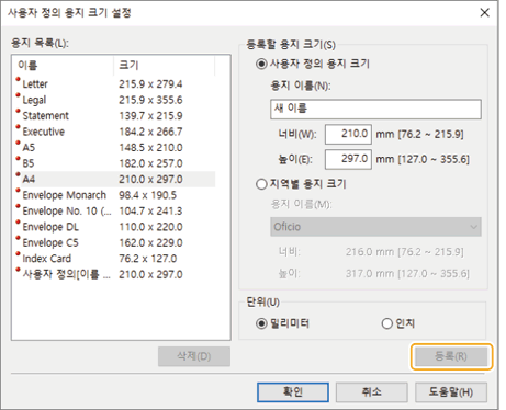 [사용자 정의 용지 크기 설정] 대화 상자에서 [사용자 정의 용지 크기 이름], [단위] 및 [용지 크기]를 지정하고 [등록]을 클릭합니다.
