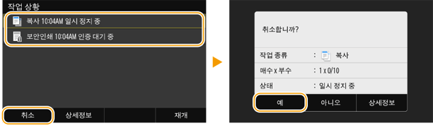 원고가 이미 스캔되었으며 인쇄 대기 중입니다. 취소할 문서를 선택하고 <취소>