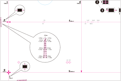 If the test page is so small that <j> is not on the page, add an arbitrary mark <j'> anywhere on the red line <h>. Then, enter the distance from <j'> to the left edge of the paper in [j]. Enter the distance from <i> to <j'> in [h].