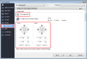 Click the [FINISHING] tab → select [Image shift] and enter the value in millimeters (inches) to move the image horizontally (X direction) and vertically (Y direction).
