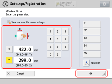 → [Preferences] → [Paper Settings] → [Paper Type Management Settings] → select the brand of paper in which the image is misaligned → press [Details/Edit] → [Change] for <Size> → [Custom Size] → enter the measured value.