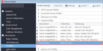 Double-click the job in Command WorkStation, and click [COLOR] → [Color input]. The simulation profile currently set is displayed. Specify the appropriate simulation profile, if necessary.