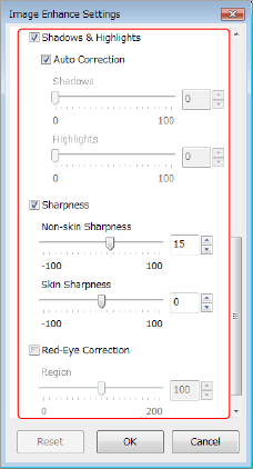 Select <Custom Settings> on the [Image Enhance Settings] screen, and adjust the values for <Custom Settings>, <Color>, <Shadows & Highlights>, <Sharpness>, and <Red-Eye Correction>.