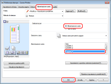 Se si deseleziona la casella di controllo <Rendimento ottimale>, la macchina passa da una fonte alimentazione carta ad un'altra una volta che quella in uso esaurisce completamente la carta. La stampa viene interrotta per qualche istante durante il cambio della fonte alimentazione carta. Se si seleziona la casella di controllo <Rendimento ottimale>, la macchina passa da una fonte alimentazione carta ad un'altra quando ha ancora da 50 a 100 fogli di carta rimanenti nella fonte alimentazione carta in uso. Questo previene l'interruzione del lavoro di stampa ed aiuta a migliorare il rendimento.