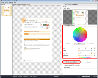 Sélectionner l'onglet [Roue chromatique] dans le volet [Ajustement couleur], puis déplacer le curseur pour modifier toutes les couleurs de la page comme désiré.