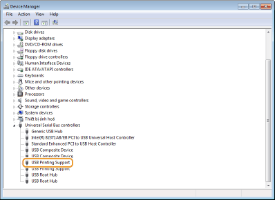 Mở [Universal Serial Bus controllers] và kiểm tra xem [USB Printing Support] có được hiển thị không.