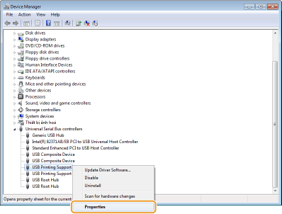 Nhấp chuột phải vào [USB Printing Support] và nhấp vào [Properties].