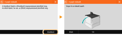Ha elakadt a papír, akkor a képernyőn megjelenik <A papír elakadt.> üzenet. Egyszerű megoldások megjelenítéséhez nyomja meg a <Következő> (