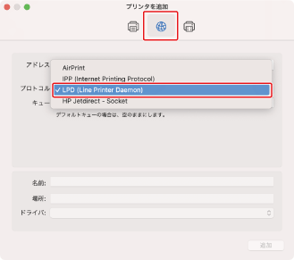IP]をクリックし、[プロトコル]から[LPD (Line Printer Daemon)]を選ぶ