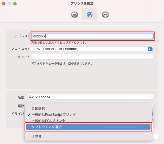 [アドレス]に、本機のIPアドレスを入力し、[ドライバ]から[ソフトウェアを選択]を選ぶ