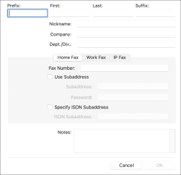 Specify at least one of name ([Last], [First], [Nickname], or [Company]) and at least one [Fax Number] ([Home Fax], [Work Fax], [IP Fax], or [Fax Number/URI]).