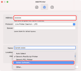 Enter the IP address of the machine in [Address], and then select [Select Software] in [Use].