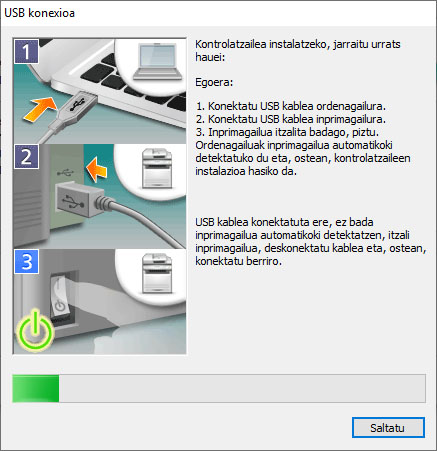 Gailua USB bidez konektatuta dagoela driverra instalatzeko metodoari buruz gehiago jakiteko, irakurri inprimagailu-kontrolatzailearen eskuliburua.