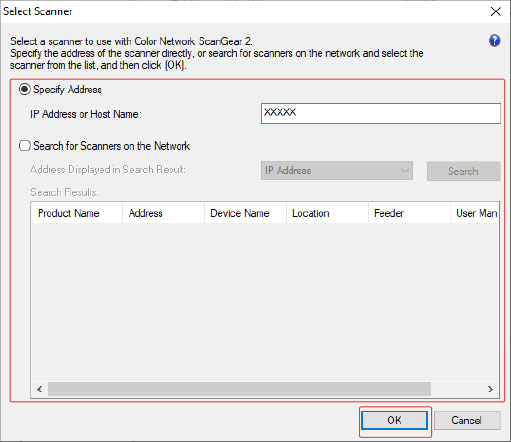 (1) Select [Search for Scanners on the Network] → select [IP Address] or [IP Address or Host Name] from [Address Displayed in Search Result] → click [Search].