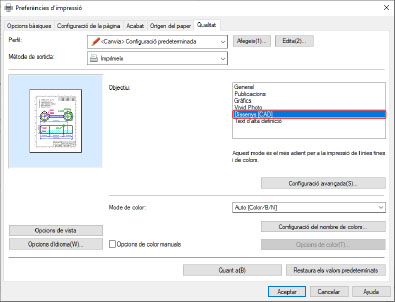 La configuració a [Objectiu] pot no ser adequada per a la impressió CAD.